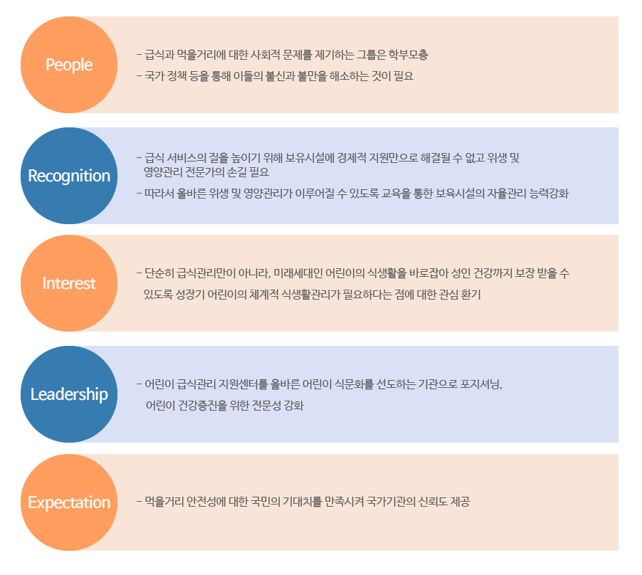 - 단순히 급식관리만이 아니라, 미래세대인 어린이의 식생활을 바로잡아 성인 건강까지 보장 받을 수 있도록 성장기 어린이의 체계적 식생활관리가 필요하다는 점에 대한 관심 환기